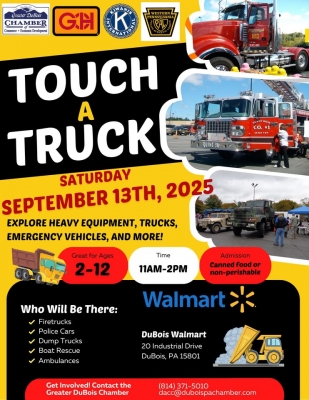 Get ready for an afternoon of big wheels, flashing lights, and nonstop fun! The Greater DuBois Chamber’s Touch-A-Truck event rolls into town on Saturday, September 13 from 11 AM to 2 PM at the DuBois Walmart Parking Lot (20 Industrial Drive, DuBois, PA).
