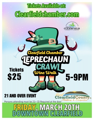 Did you know Spring is just 7 weeks away! Let's celebrate the first day of Spring with the Leprechaun Crawl Wine and Beer Walk Friday, March 20, 2026! Shake off the Winter blues, and toast a new season with reds, whites, and brews! Tickets on sale now at www.ClearfieldChamber.com